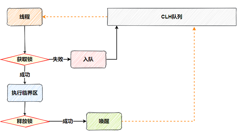 在说非公平策略前,先简单的说下A Q S(AbstractQueuedSynchronizer)流程,A Q S为加锁和解锁过程提供了统一的模板函数,加锁与解锁的模板流程是,获取锁失败的线程,会进入CLH队列阻塞,其他线程解锁会唤醒CLH队列线程,如下图所示(简化流程)