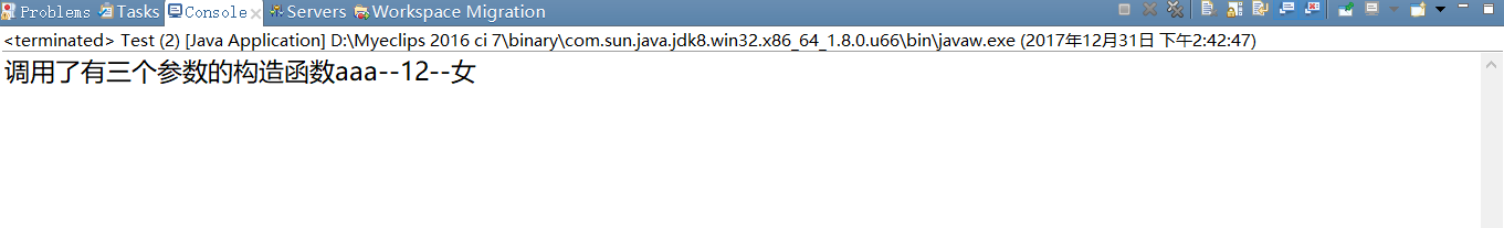 1 package Constructor; 2 3 public class Son extends Father{ 4 5 public Son(String name, int age, String sex) { 6 super(name, age, sex); 7 // TODO Auto-generated constructor stub 8 } 9 10 11 } 12 13 14 15 16 17 package Constructor; 18 19 public class Test { 20 21 public static void main(String[] args) { 22 // TODO Auto-generated method stub 23 Son s=new Son("aaa", 12, "女"); 24 } 25 }
