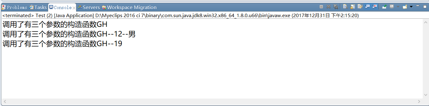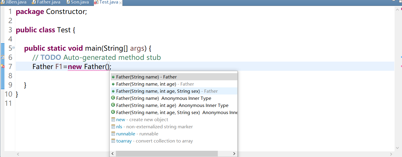 1 package Constructor; 2 3 public class Test { 4 5 public static void main(String[] args) { 6 // TODO Auto-generated method stub 7 Father F1=new Father("GH"); 8 9 Father F2=new Father("GH",12,"男"); 10 11 Father F3=new Father("GH",19); 12 } 13 }