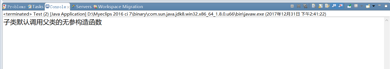 1 public Father() { 2 System.out.println("子类默认调用父类的无参构造函数"); 3 } 4 5 6 7 public class Son extends Father{ 8 9 } 10 11 12 13 public static void main(String[] args) { 14 // TODO Auto-generated method stub 15 Son s=new Son(); 16 }