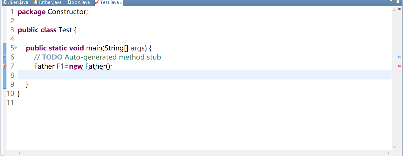 1 package Constructor; 2 3 public class Test { 4 5 public static void main(String[] args) { 6 // TODO Auto-generated method stub 7 Father F1=new Father(); 8 9 } 10 }