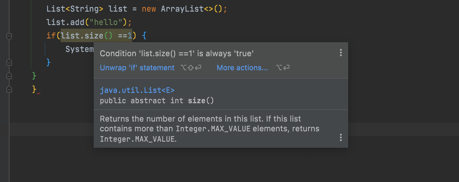 数据流分析的另一个有用更新是,它现在通过以下方法在集合更新后跟踪集合的大小:add、addAll、put、putAll、remove、removeAll 和 retainAll。如果检测到有任何错误,检查将突出显示它们。
