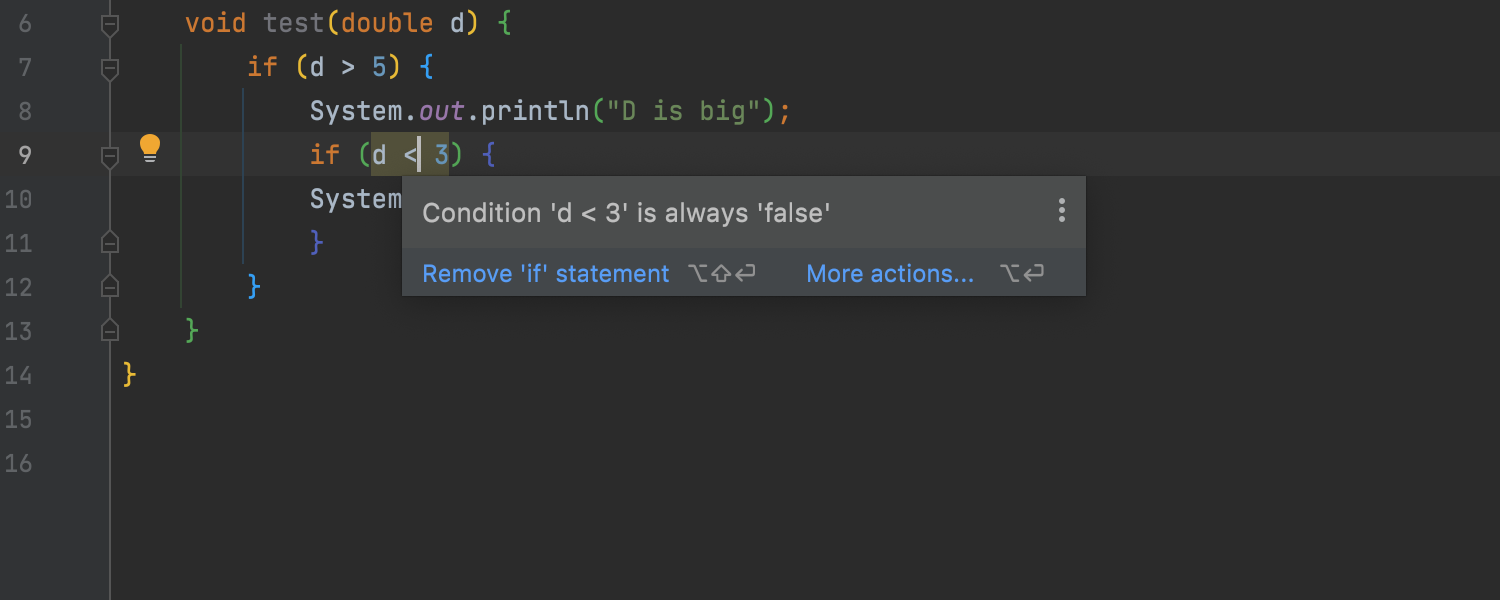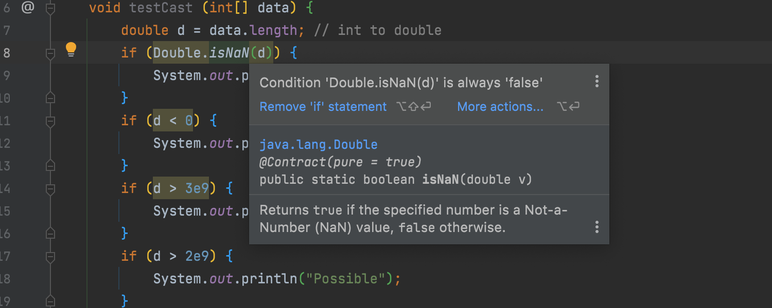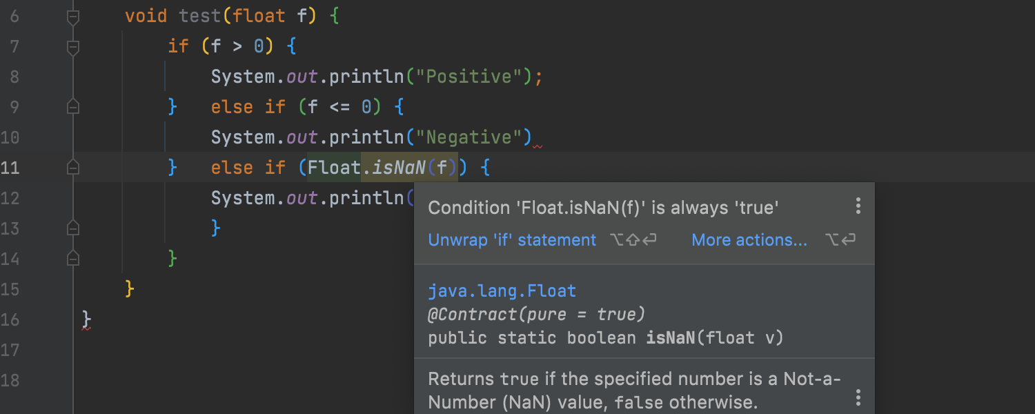 数据流分析允许你跟踪 float 和 double values 的范围。IntelliJ IDEA 现在可以使用 doubles 和 Float.isNan 统计验证条件。