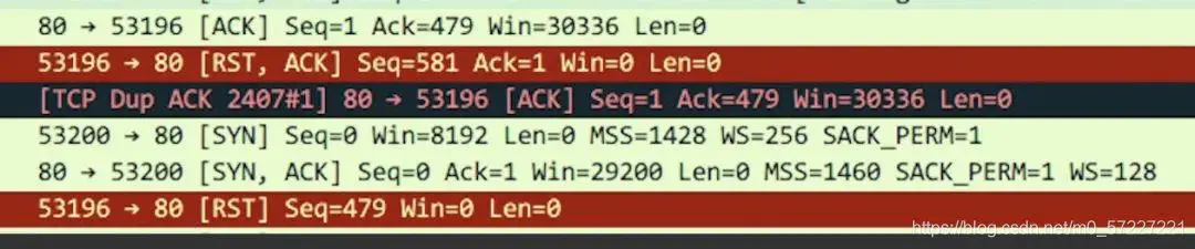 接下来我们通过wireshark打开抓到的包,可能就能看到如下图所示,红色的就表示RST包了