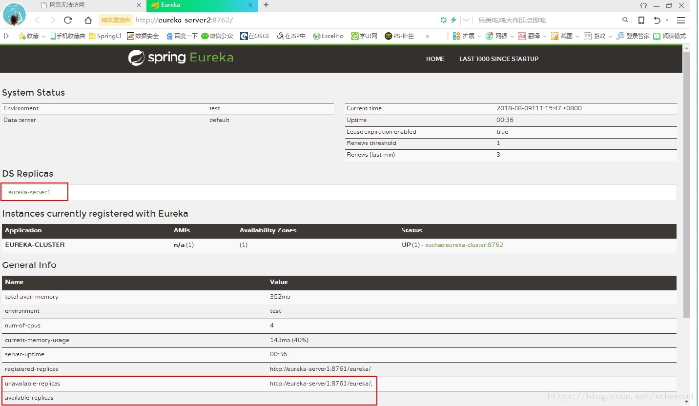 从上面两张图可以看出,DS Replicas、registered-replicas、available-replicas分别有了对方的地址,即:相互Replicate、相互注册,则说明Eureka集群成功。