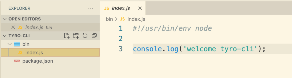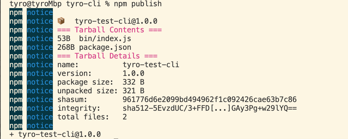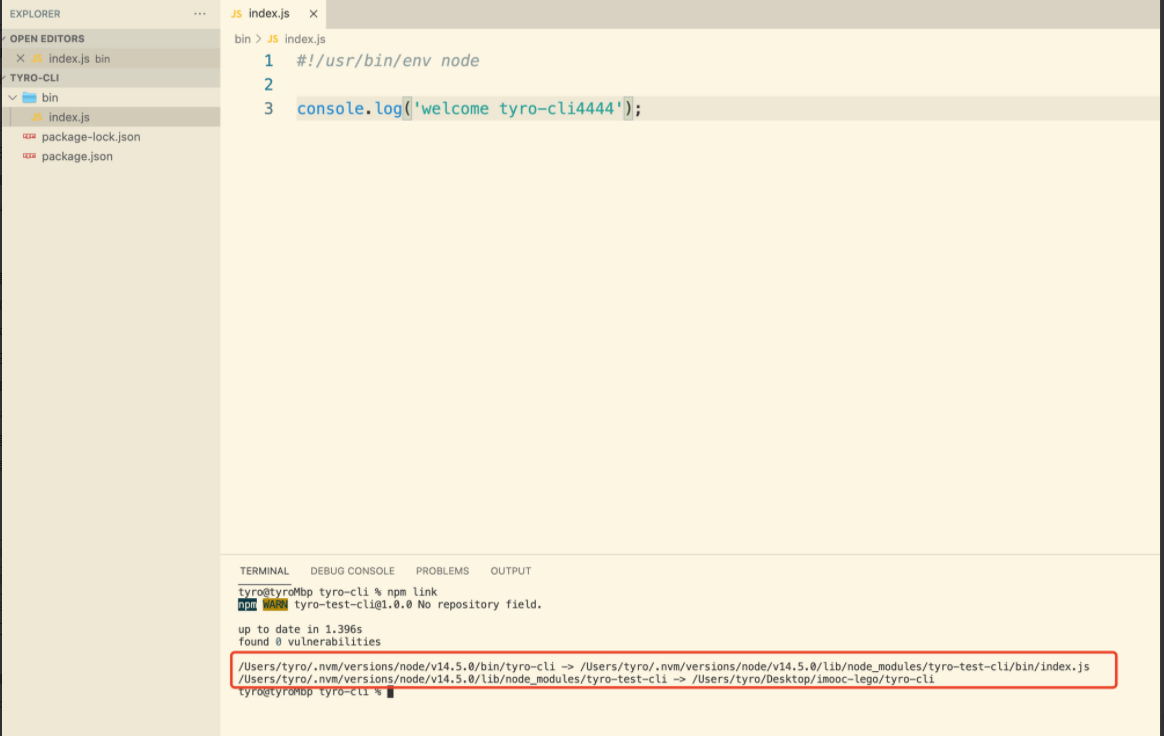答案当然不是,脚手架本地开发调试有两种方式。前面我们已经了解了脚手架命令其实是链接到了某个具体的执行文件,我们这里tyro-cli命令链接指向的是 bin/index.js。所以第一种本地运行调试的方法是在本地包目录下直接执行 bin/index.js :