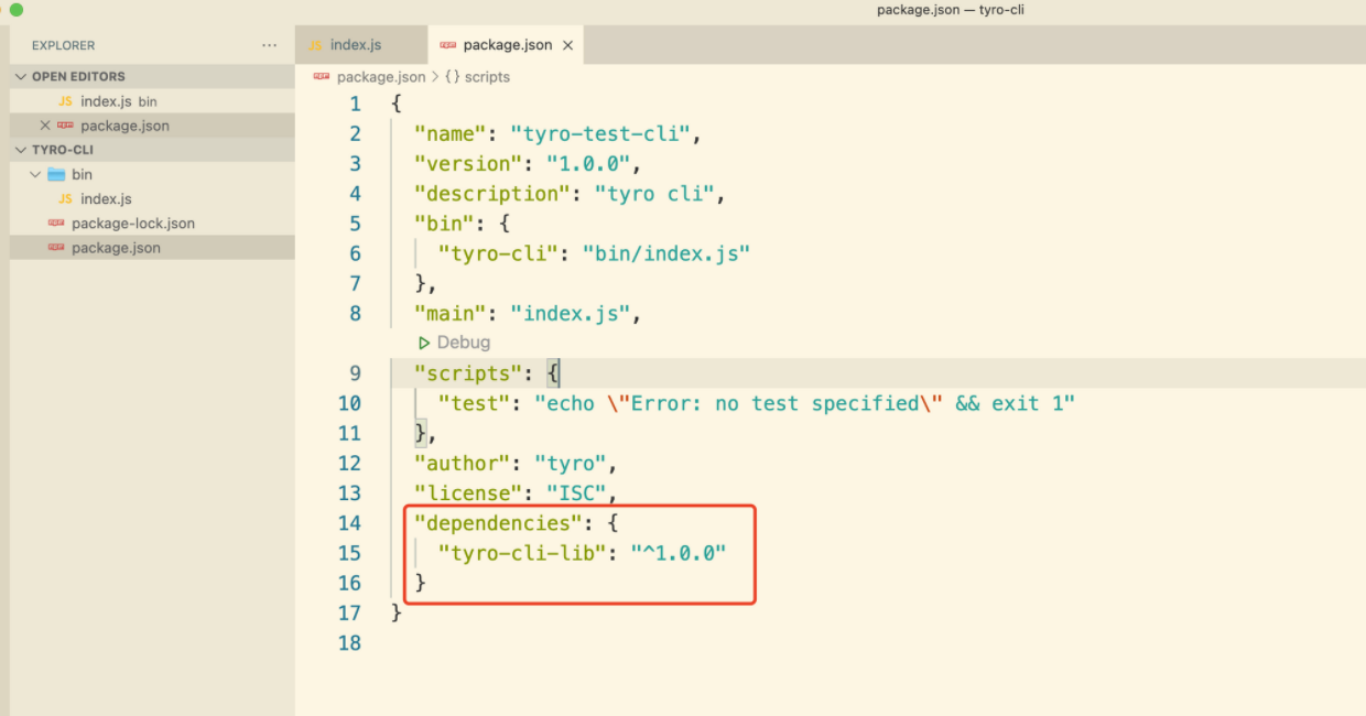 为了避免项目上线前我们忘了给tyro-cli添加对tyro-cli-lib包的依赖,我们需要在 package.json 文件中手动添加对分包的依赖。