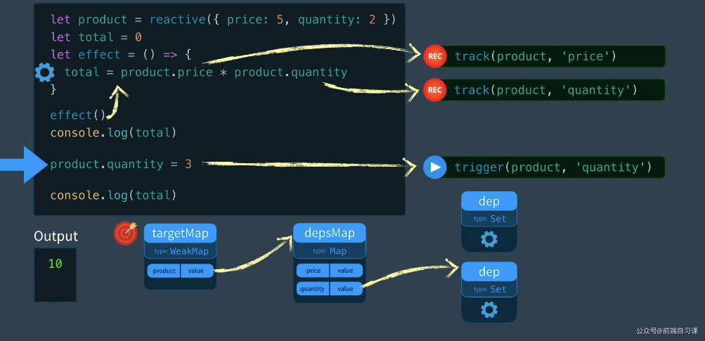 在每次修改 price 或 quantity 后,调用 trigger() 函数执行所有副作用后, total 值将自动更新为最新值。 ![]()