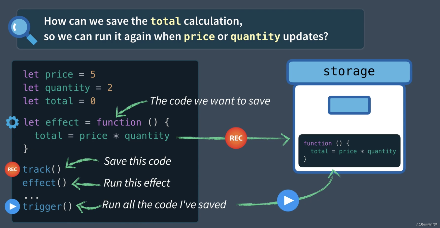 ① 初始化一个 Set 类型的 dep 变量,用来存放需要执行的副作用( effect 函数),这边是修改 total 值的方法;