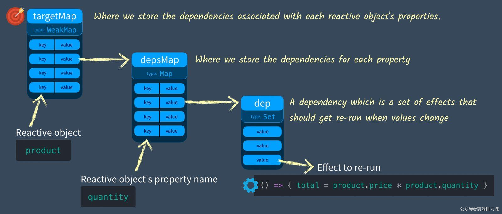 ① 初始化一个 WeakMap 类型的 targetMap 变量,用来要观察每个响应式对象;