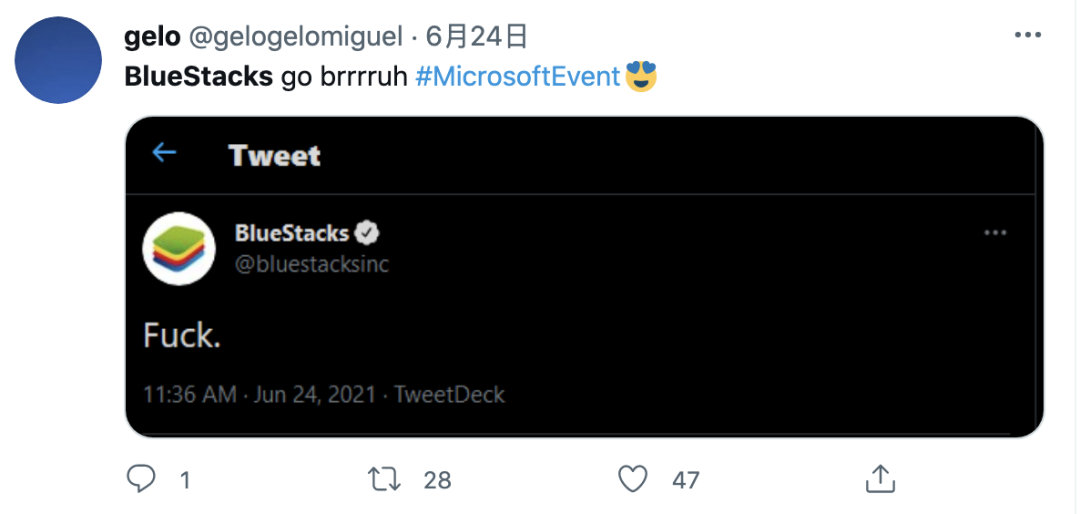面对操作系统级别的降维打击,twitter上出现了著名模拟器BlueStacks爆了粗口(现在去看没有看到这条,不知道是删除了还是伪造)