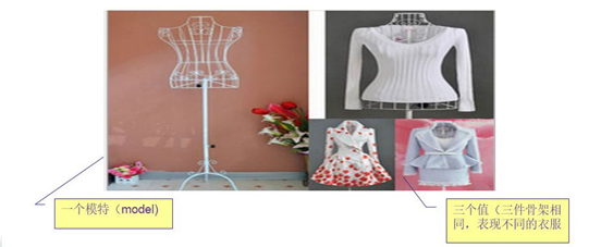 上图中,左边的模特, 抽象一点,不过八两铁丝,一些手艺;披上了衣服后,加上想象,就有了的美感、就产生了价值或数值;用计算机专业的行话,左边是“型”,右边是“值”。