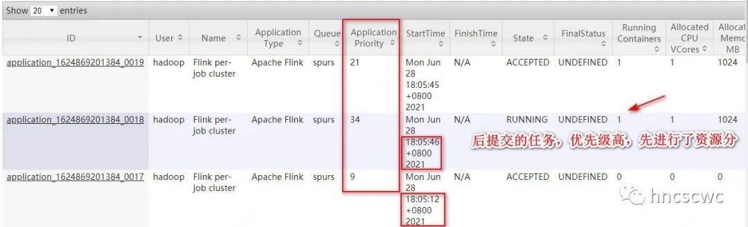 从上图可以清楚的看到,优先级为9的任务,其提交时间比优先级为34、优先级为21的任务都要早,但优先级为34、21的任务却优先分配到了资源。(从RM的日志可以更近一步的看到,优先级为34的任务最先分配到资源)