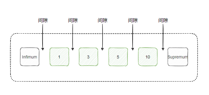 比如此时有 1、3、5、10 这四条记录,之前的文章分析过,数据页中还有两条虚拟的记录,分别是 Infimum 和 Supremum。