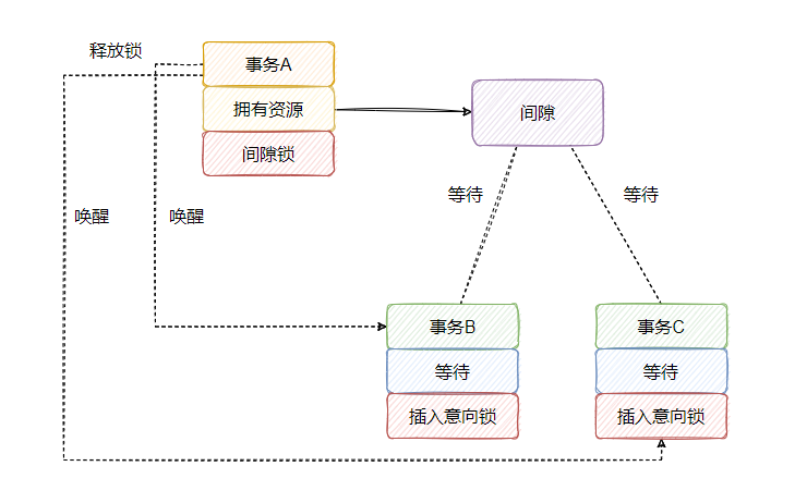这样一来,间隙锁的事务在释放间隙锁的时候,才能得以找到那些等待插入的事务,然后进行唤醒,而由锁的类型也可以得知是插入意向锁,之间不需要阻塞,所以可以一起执行插入。