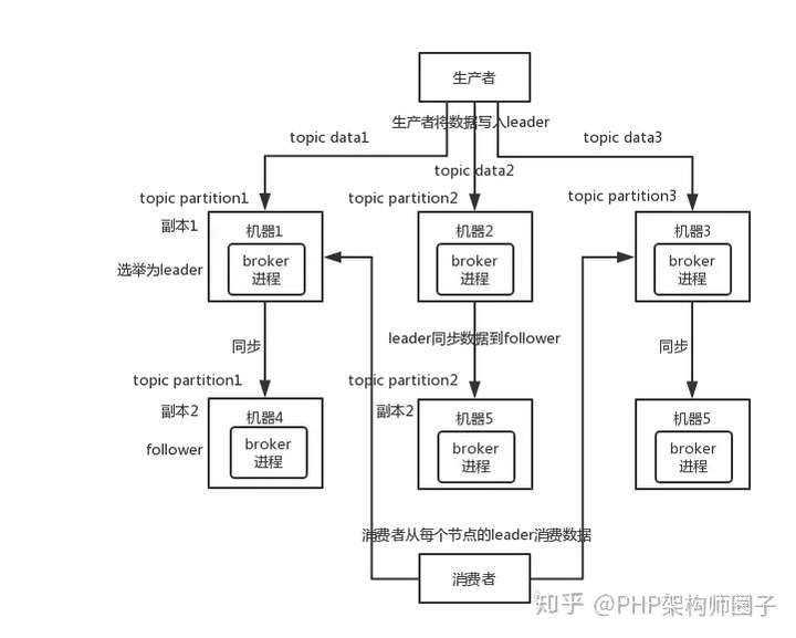 比如说,我们假设创建了一个 topic,指定其 partition 数量是 3 个,分别在三台机器上。但是,如果第二台机器宕机了,会导致这个 topic 的 1/3 的数据就丢了,因此这个是做不到高可用的。