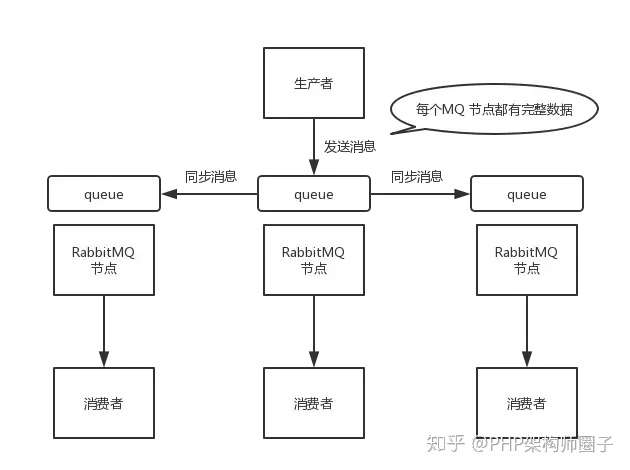 这样的话,好处在于,你任何一个机器宕机了,没事儿,其它机器(节点)还包含了这个 queue 的完整数据,别的 consumer 都可以到其它节点上去消费数据。坏处在于,第一,这个性能开销也太大了吧,消息需要同步到所有机器上,导致网络带宽压力和消耗很重!第二,这些玩儿,不是分布式的,就没有扩展性可言了,如果某个 queue 负载很重,你加机器,新增的机器也包含了这个 queue 的所有数据,并没有办法线性扩展你的 queue。