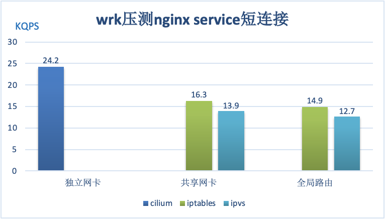 测试数据表明,基于 Cilium 的独立网卡 ClusterIP 访问方案性能最好。在短连接场景下,其 QPS 相比共享网卡的 iptables 和 ipvs 方案提升48%和74%,相比全局路由的 iptables 和 ipvs 方案提升了62%和91%。在长连接场景下,其 QPS 相比共享网卡的 iptables 和 ipvs 方案提升了33%和57%,而相比全局路由的 iptables 和 ipvs 方案提升了49%和66%。iptables 的性能较 ipvs 性能较好是因为测试环境中 Service 数量还不够多,ipvs 的优势在于大量 Service 的场景。