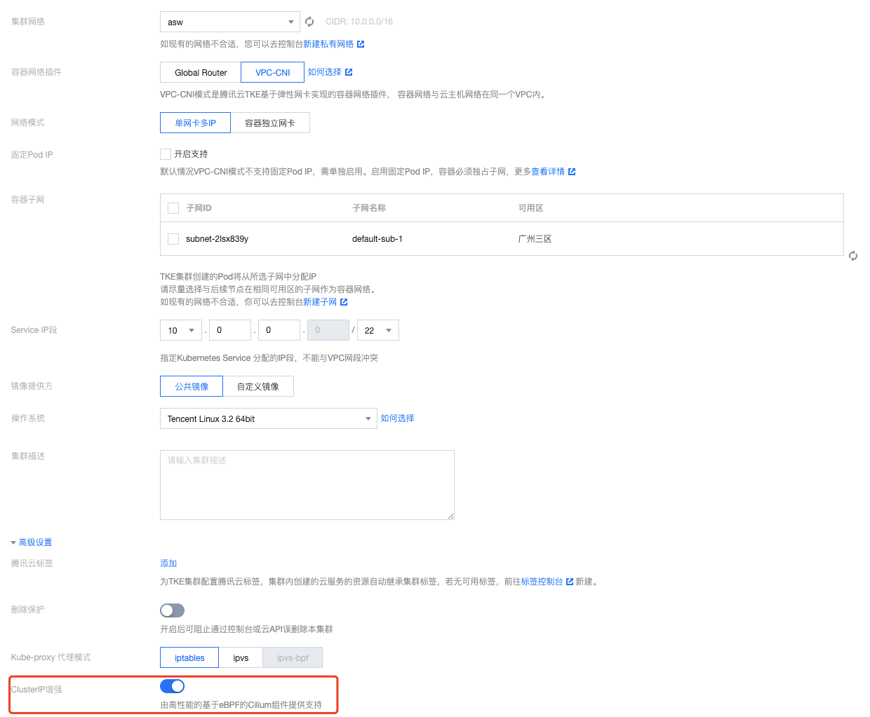 申请 Cilium 支持 ClusterIP 产品化内测开通后,创建 TKE 集群时高级设置中打开 ClusterIP 增强 即可: