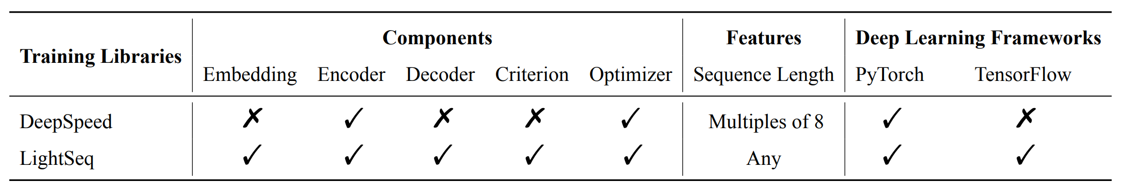 以下是 LightSeq 训练库支持的矩阵与 DeepSpeed 对比。