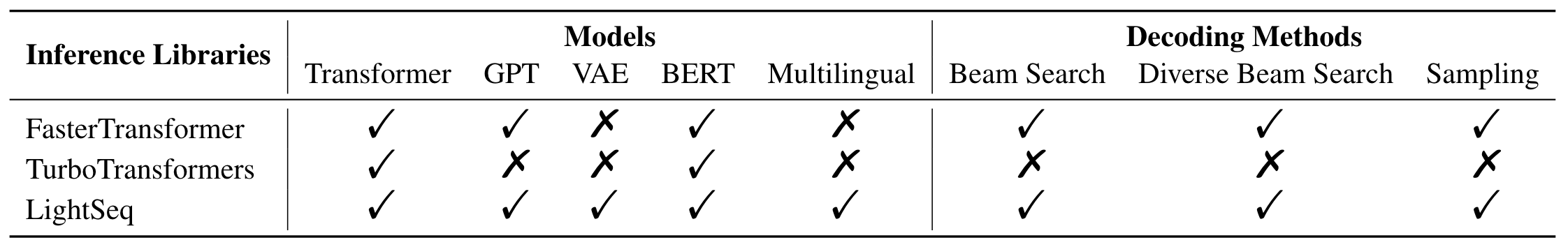 以下是 LightSeq 推理库支持矩阵与 TurboTransformers 和 FasterTransformer 的对比。