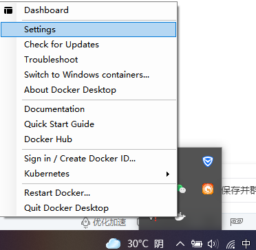 鼠标右键docker图标,点击setting