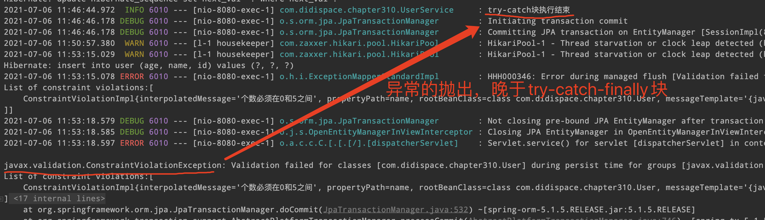 但还是收到了很多没有理解的反馈,主要是根据前文给出的线索去跟踪,是获得到了回滚的标示和异常,而让大家不理解的是,javax.validation.ConstraintViolationException异常不是最后也向外抛出了,那么为什么test4里catch没有能够捕获到呢?
