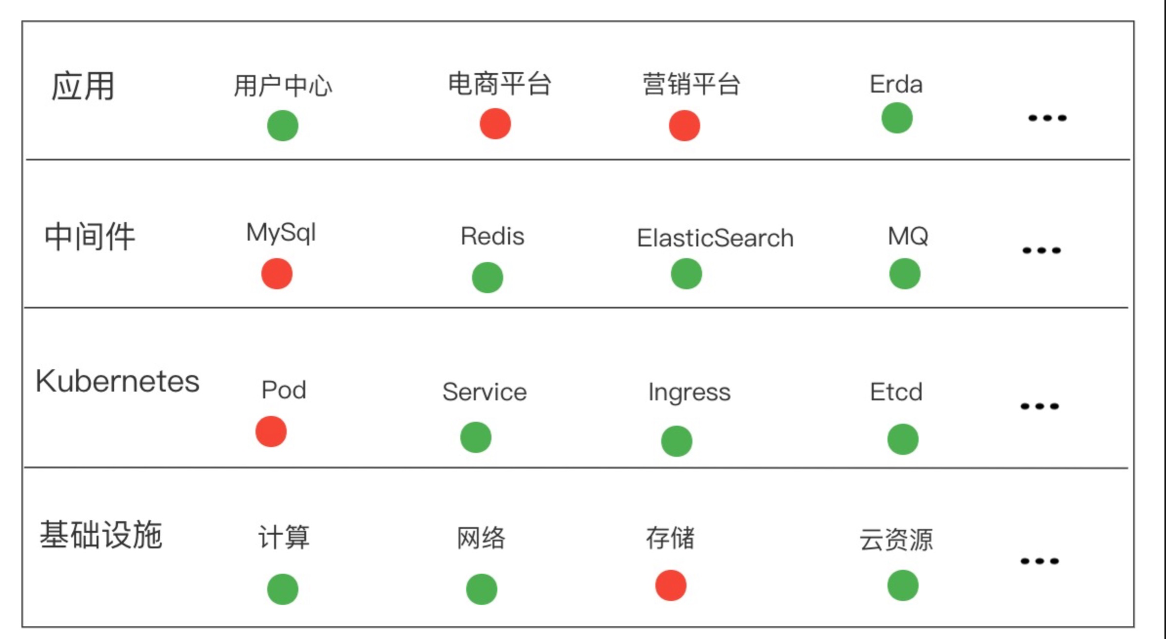 我们期望有一个输出可以清晰的看到当前集群的运行状态,因此,我们建议所有的 Probe 都尽可能属于应用、中间件、Kubernets、基础设置这四大场景,这样我们可以在展示状态的时候,自上而下清楚地查看究竟是系统中哪个层面引起的问题。