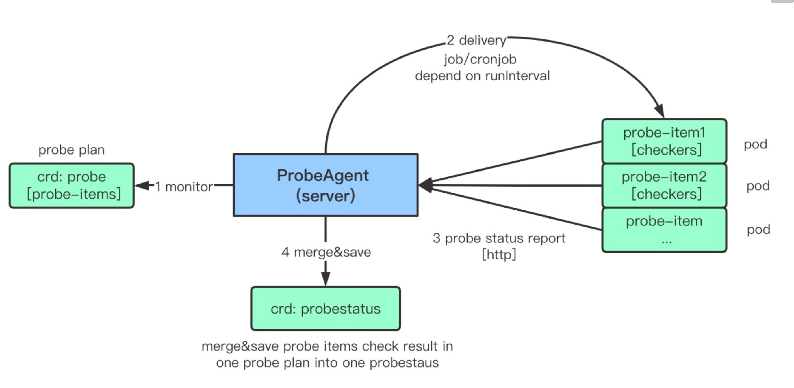 kubeprobe 中运行的诊断计划我们称之为 Probe,一个 Probe 为一个诊断项的集合,我们建议将统一场景下的诊断项作为一个 Probe 来运行,probe-agent 组件会 watch probe 资源,执行 Probe 中定义的诊断项,并且将结果写在 ProbeStatus 的资源中。