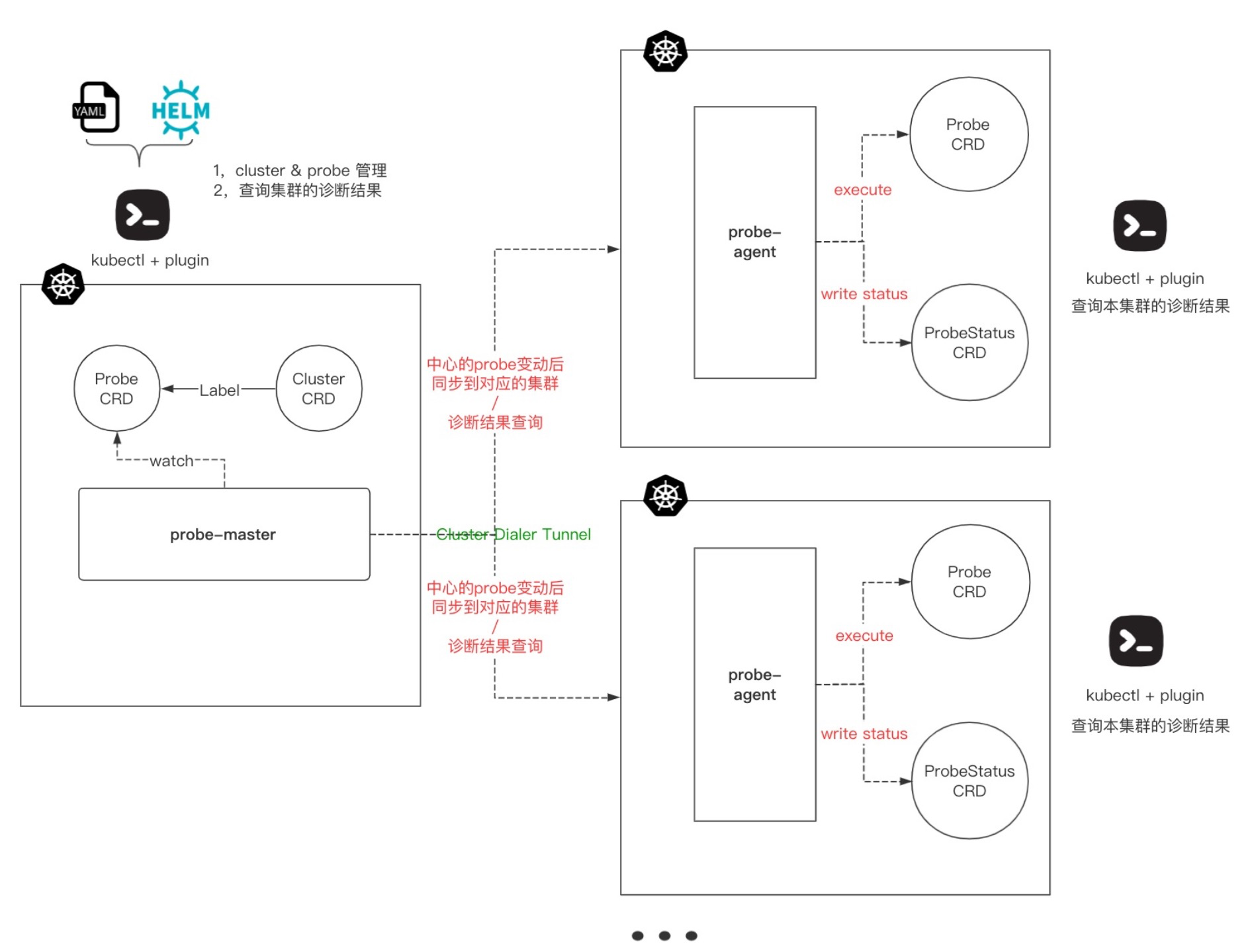 运行在管理集群上的 operator,这个 operator 维护两个 CRD,一个是 Cluster,用于管理被纳管的集群;另一个是 Probe,用于管理内置的以及用户自己编写的诊断项,probe-master 通过 watch 这两个 CRD,将最新的诊断配置推送到被纳管的集群,同时 probe-master 提供接口用于查看被纳管集群的诊断结果。