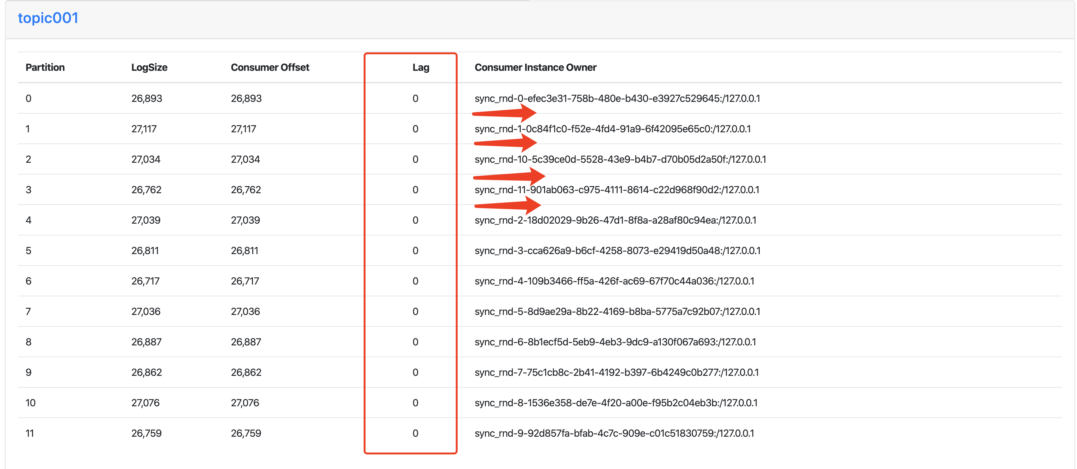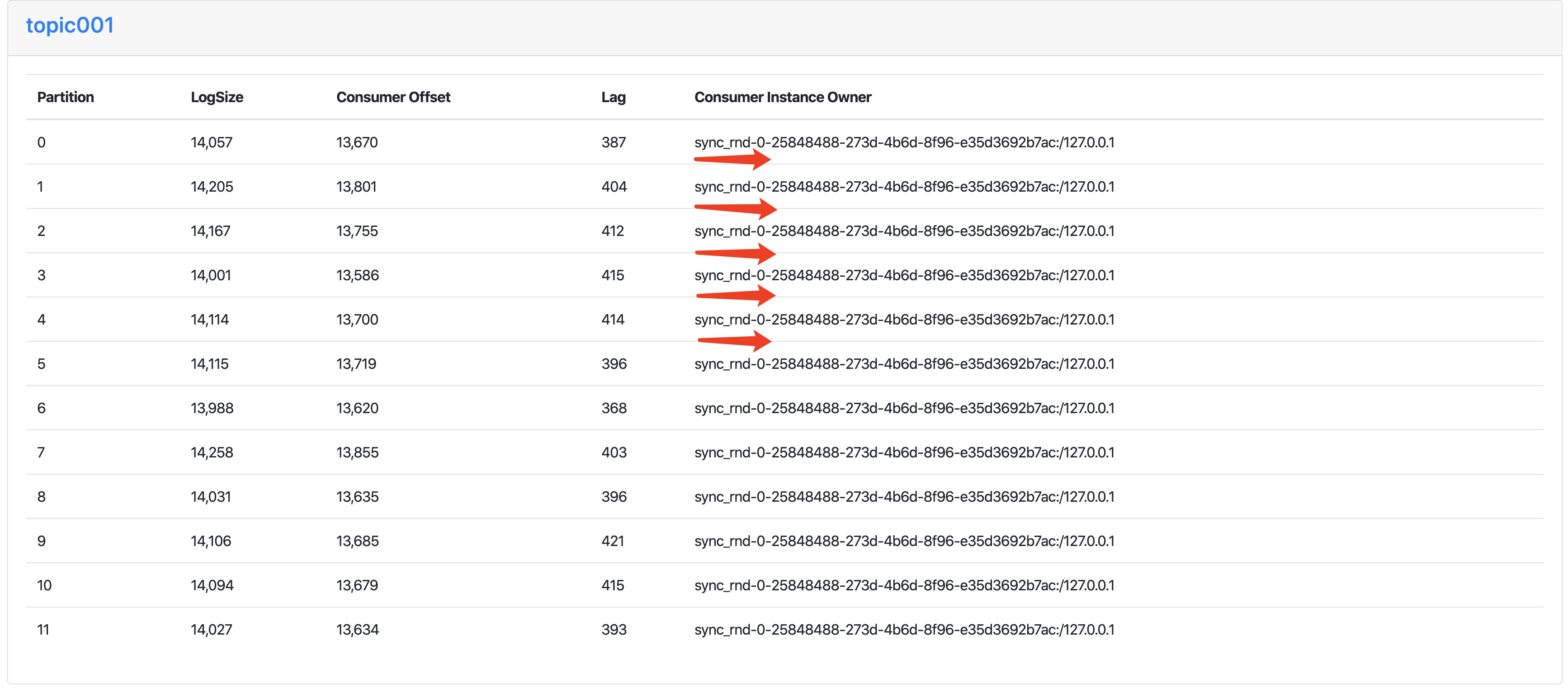 1、从单消费线程的 MirrorMarkerMain001 切换到 MirrorMarkerMain001、MirrorMarkerMain002 同时工作,会触发 Consumer group 的消费重平衡,这个从 topic001 的 partition 的 Consumer Instance Owner 就能看出来