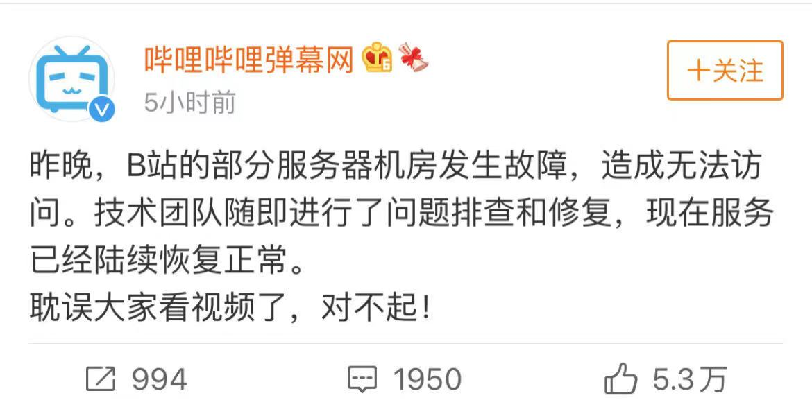所以下篇我再借着 B 站挂了的情况,从面试的角度来讲讲,关注我等着哈。
