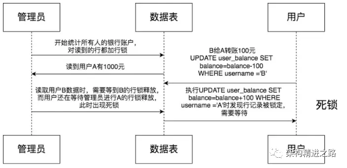 Case2:当我们读取的时候用了加行锁,可能会出现死锁的情况,如下图所示。