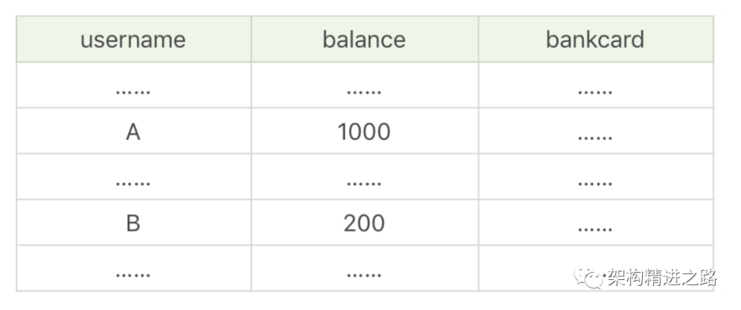 假设有个账户金额表 user_balance,包括三个字段,分别是 username 用户名、balance 余额和 bankcard 卡号,表数据如下所示: