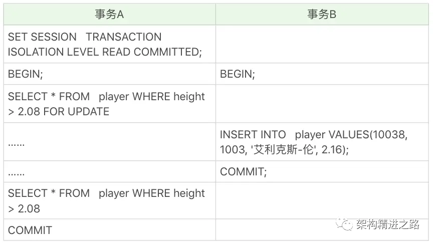 1、在读已提交的情况下,即使采用了 MVCC 方式也会出现幻读