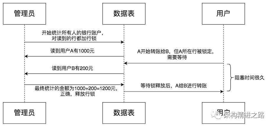 用户 A 和用户 B 之间进行转账,此时数据库管理员想要查询 user_balance 表中的总金额,两个场景存在并发情况,在没有MVCC的情况下,会出现哪些问题呢。