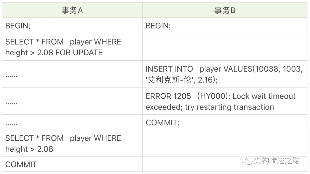 这是因为采用了 Next-Key 锁,会将 height>2.08 的范围都进行锁定,就无法插入符合这个范围的数据了。然后事务 A 重新进行条件范围的查询,就不会出现幻读的情况。