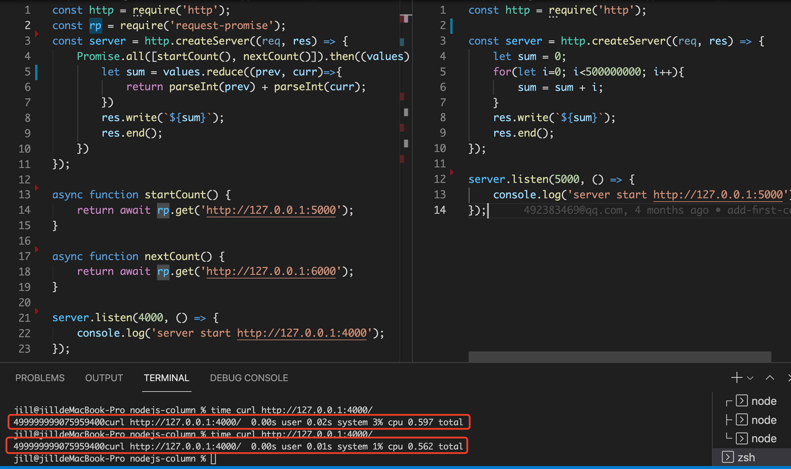 异步网络I/O充分利用了Node.js的异步事件驱动能力,将耗时CPU计算逻辑分配给其它进程处理,因此主线程可直接处理其它请求逻辑,而在主流程执行耗时CPU计算,导致其无法处理其他逻辑,进而影响性能,因此上面服务的执行时间相差甚远