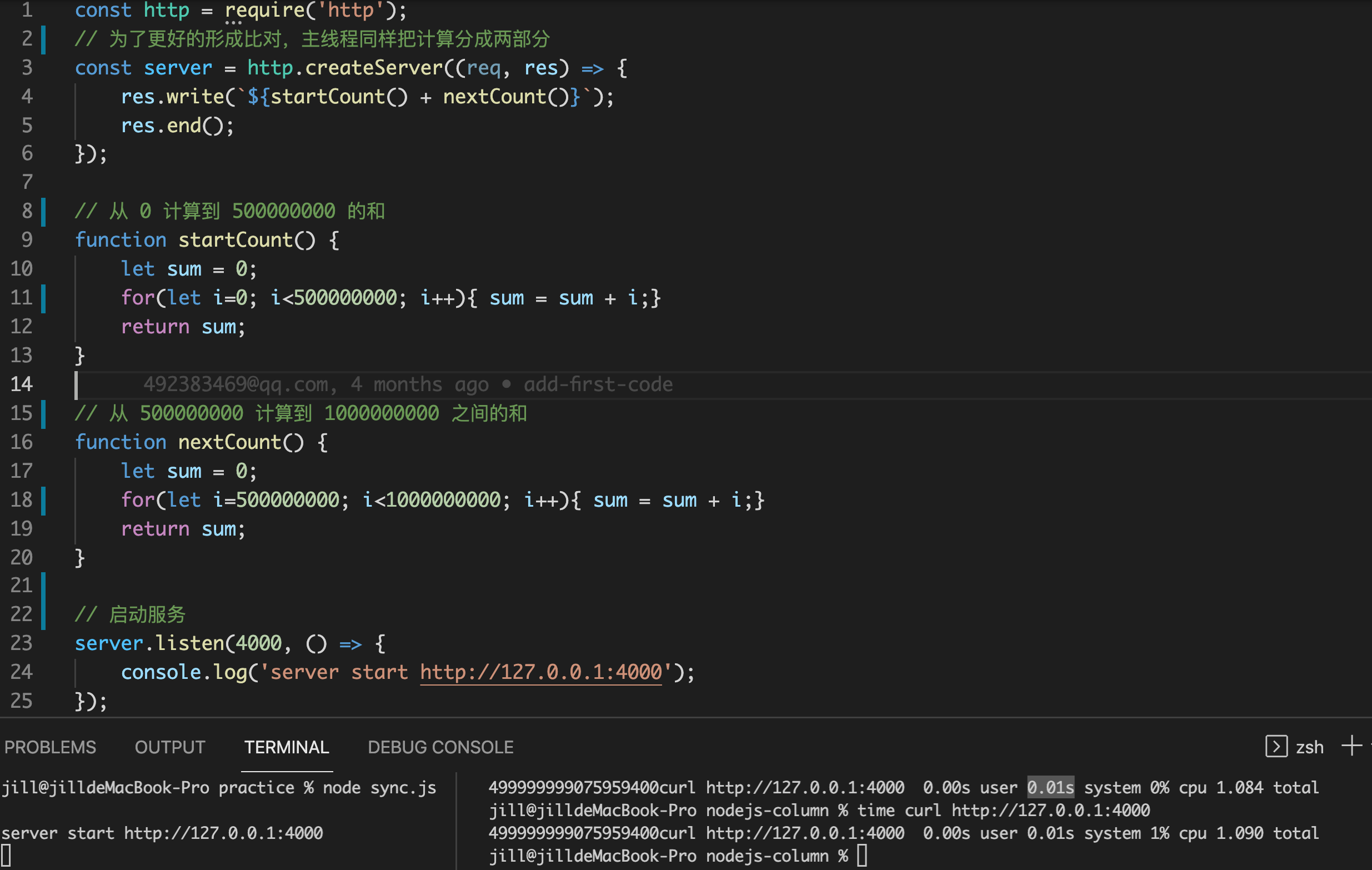 Node.js不善于处理CPU密集型的业务,易导致性能问题,我们分别执行主线程和异步I/O处理一个耗时CPU的计算(计算从0到1,000,000,000之间的和),比对各自的效果