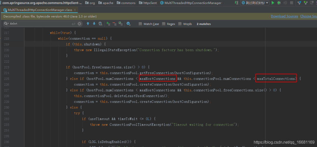如MultiThreadedHttpConnectionManager源码可见,连接池在分配连接时调用的doGetConnection方法时,对能否获得连接,不仅会对我设置的参数maxTotalConnections进行是否超限校验,还会对maxHostConnections进行是否超限的校验。