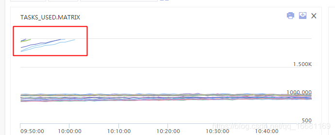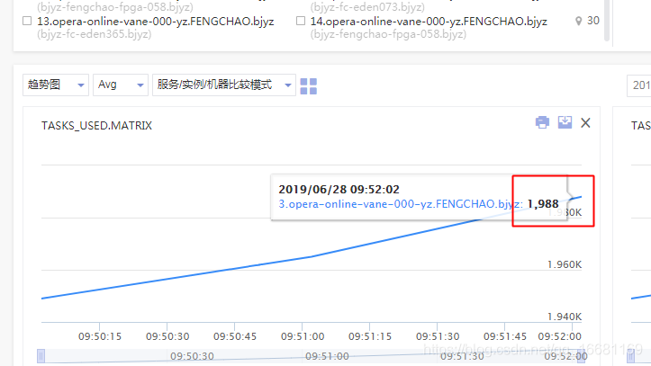 图中可以看到多个机器大概在10点初时,出现了线程数大量飙升,甚至超出了虚拟化平台对容器的2000线程数限制(平台为了避免机器上的部分容器线程数过高,导致机器整体夯死而设置的熔断保护),因此实例是被虚拟化平台kill了。之前为什么之前在南京机房小流量上线的时候没出现线程数超限的问题,应该和南京机房流量较少,只有北京机房流量的1/3有关。