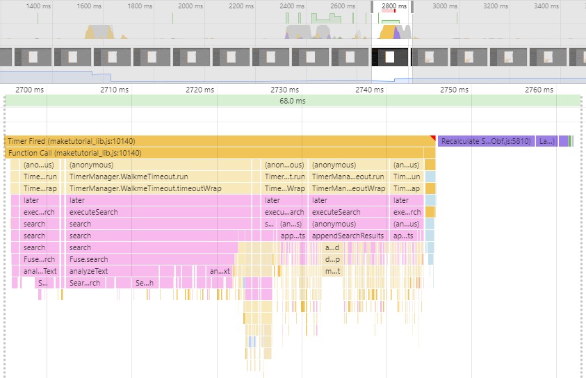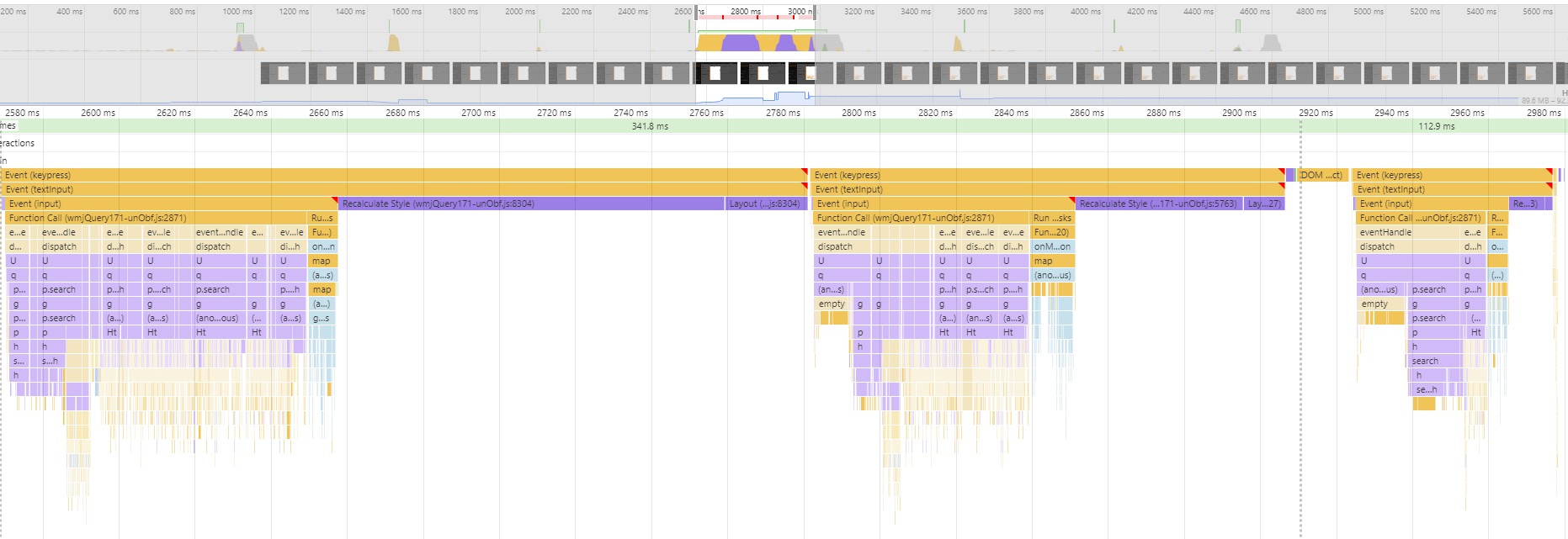 下图描述了使用防抖(Debounce)前状态的性能监控捕获,每次 keypress 引发事件时,它都会触发搜索引擎请求数据并将结果呈现在屏幕上。事实上,这些结果并没有被用户看到,因为它们已经被最新 keypress 事件的后续结果覆盖了,屏幕上仅呈现最新结果。