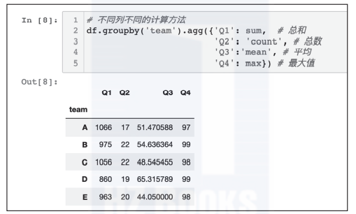 df.groupby('team').agg({'Q1': sum, # 总和