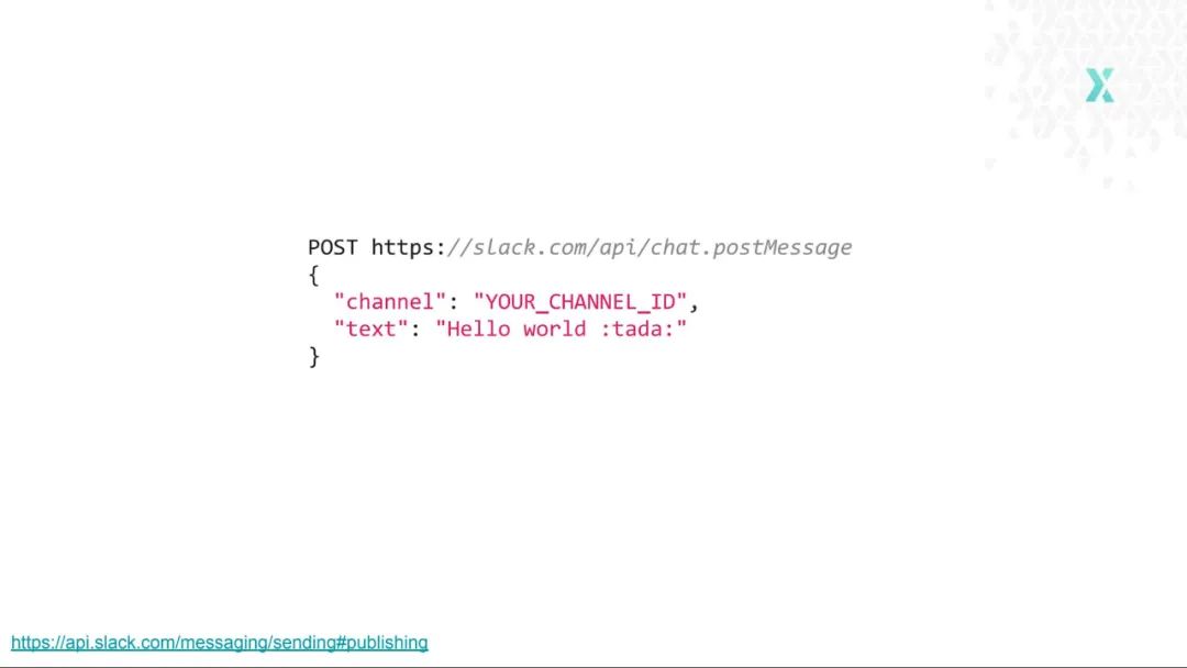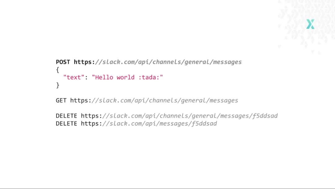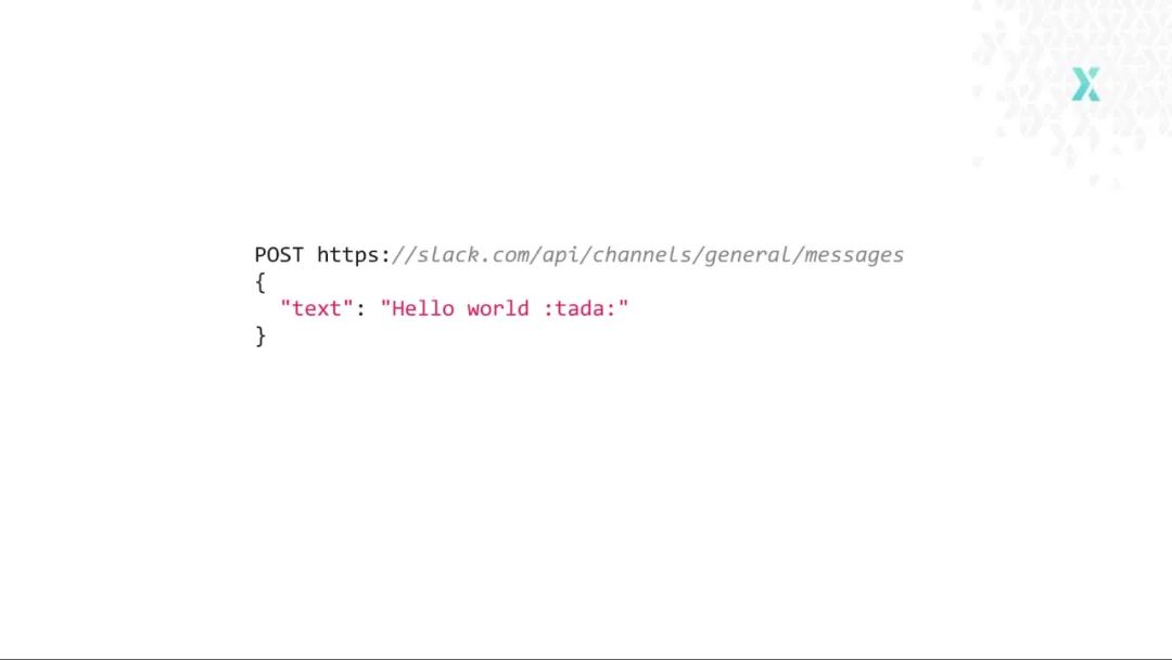 另外一个很好的例子就是 Slack API。它有些多样化,有多个端点,但依然是 RPC 风格的 API。它暴露了 Slack 的各种功能,中间没有附加任何特性。如下的代码展示了如何向一个特定的通道发送消息:
