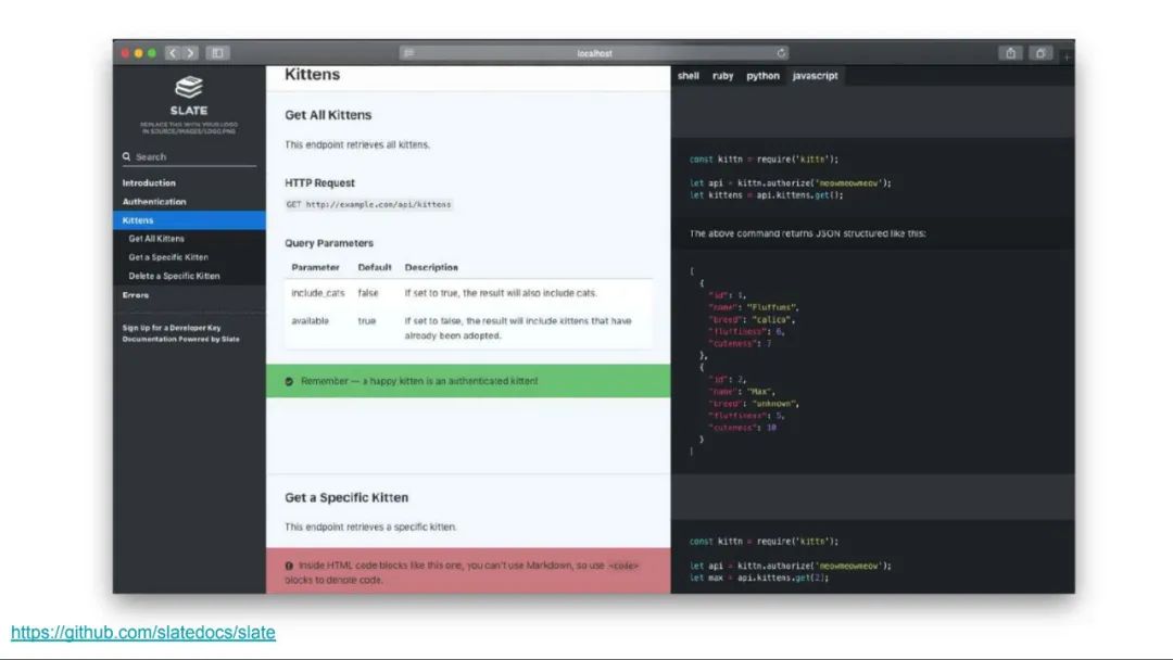 如果你不想要使用 Swagger,而是想使用更简单的工具,那该怎么办呢?有个流行的替代方案是 Slate。
