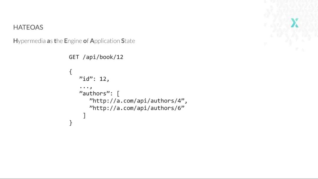 但这还不是所有的内容。HATEOAS 还可以对数据关系进行建模。我们可能会有一个关于图书的资源,并且在 URL 中没有将作者信息嵌套进来,但是我们可以包含它们的链接,如果有人对作者感兴趣的话,那么他们可以访问这些链接并探索相关的数据。