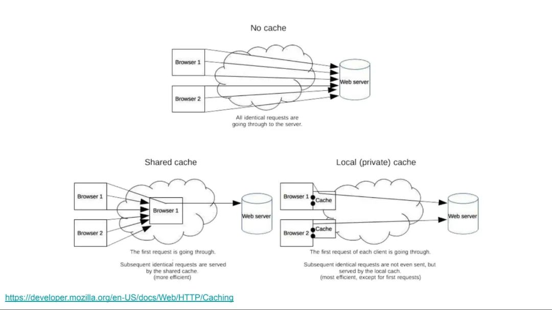 同时,因为缓存是 HTTP 规范的一部分,所以很多涉及 HTTP 的技术都知道如何进行缓存:浏览器原生支持缓存,客户端和服务器之间的中间技术也是如此。