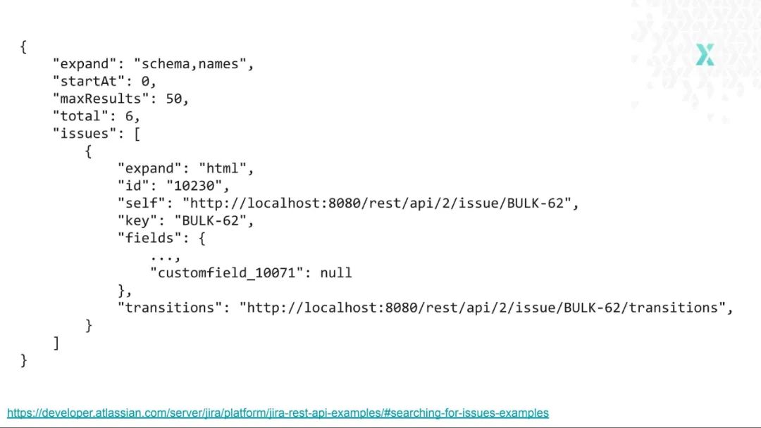 HATEOAS 不像其他成熟度模型的等级那样流行,但是有些开发人员确实在使用它。其中一个样例就是 Jira,如下是它们的搜索 API 的响应: