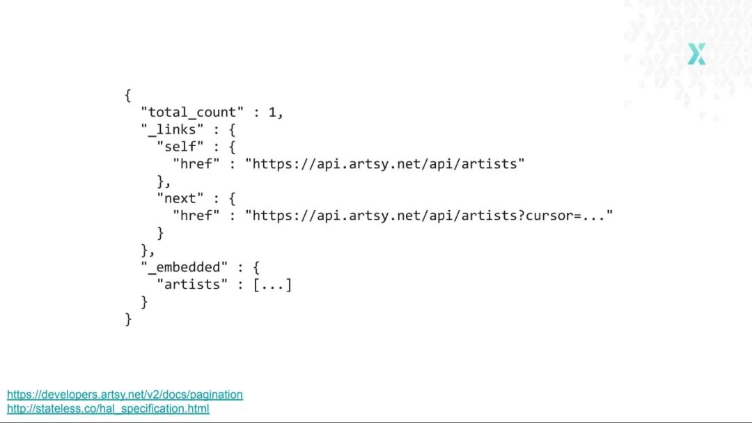 另外一个使用 HATEOAS 的样例是 Artsy。他们的 API 严重依赖 HATEOAS,并且还使用了 JSON Plus 调用规范,按照该规范强制要求使用一种特殊的约定来构建链接。下面是一个分页的例子,这是使用 HATEOAS 最酷的样例之一:
