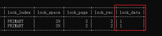 (我没看过源码,个人推断如下:)执行 select ... for update ,由于 name 字段没有索引,索引事务 A、B 只能加锁到主键索引上,此时需要搜索 name 为 yes 的记录,但是又没有索引,只能全表扫描,恰巧扫描第一条记录就符合要求了,于是上锁,然后接着往后扫描,后面不符合条件所以没有上锁。此时事务 B 加锁,过程和事务 A 一样需要从第一条记录开始扫描上锁,但此时第一条记录已经被事务 A 锁了,所以第一条记录就冲突了,而第一条记录的 id 就是为 1,因此 lock_data 为 1。